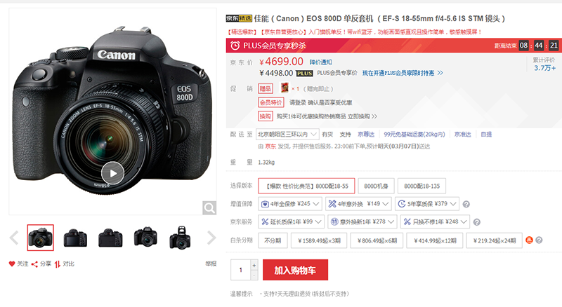 價值4699元的佳能(Canon)EOS 800D 單反套機 (EF-S 18-55mm f/4-5.6 IS STM 鏡頭)