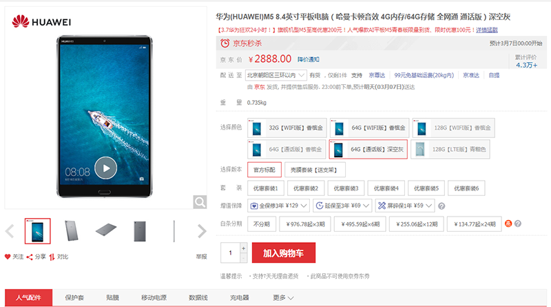 價值2888元的華為(HUAWEI)M5 8.4英寸平板電腦(哈曼卡頓音效 4G內存/64G存儲 全網通 通話版)深空灰