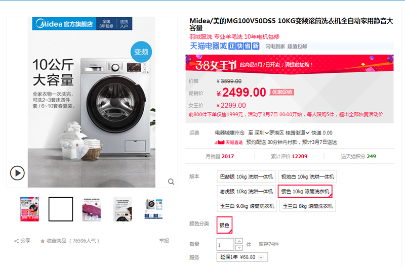 價值2499的Midea/美的MG100V50DS5 10KG變頻滾筒洗衣機