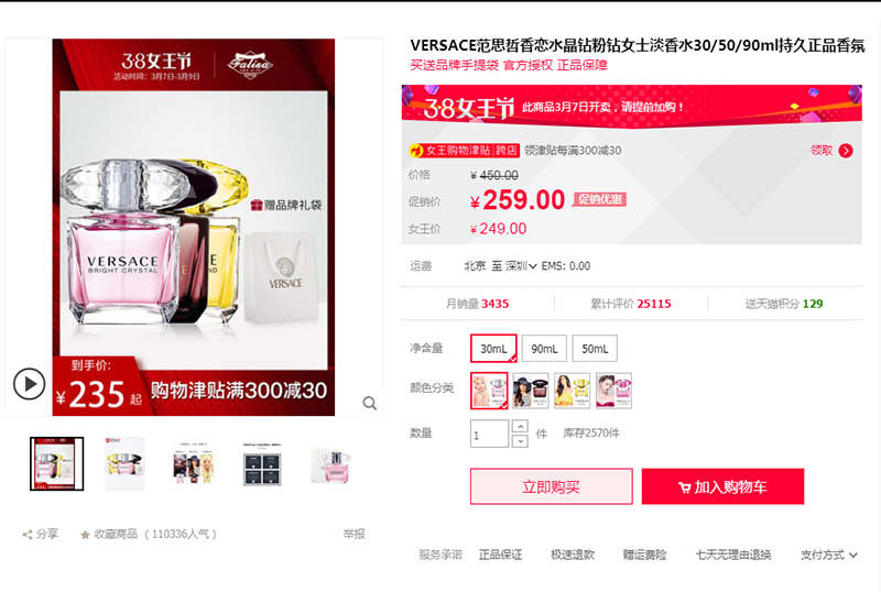 價值259元的VERSACE范思哲香戀水晶鉆粉鉆女士淡香水